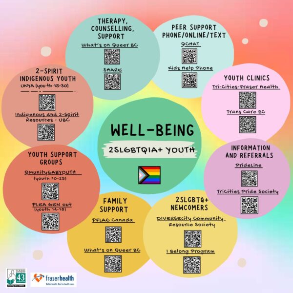 This poster provides links to resources for 2S/LGBTQIA+ youth in the Tri-Cities, with both local and regional resources listed. Click the image for a full-sized poster with clickable links!
