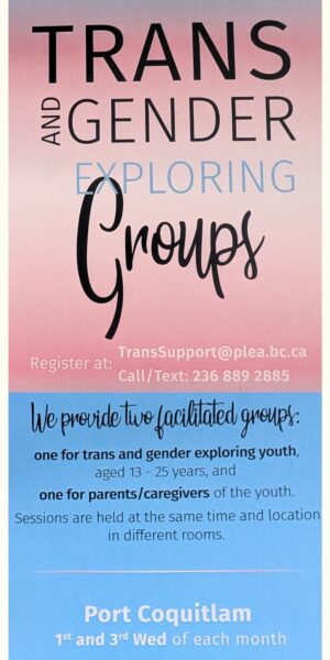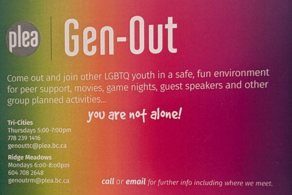 Did you know there are support groups specifically for queer and trans youth in the Tri-Cities? Run through PLEA, Gen Out provides a space for queer and questioning youth to meet and spend time together, playing games, watching movies, and having guest speakers. Click the image below to access their webpage.